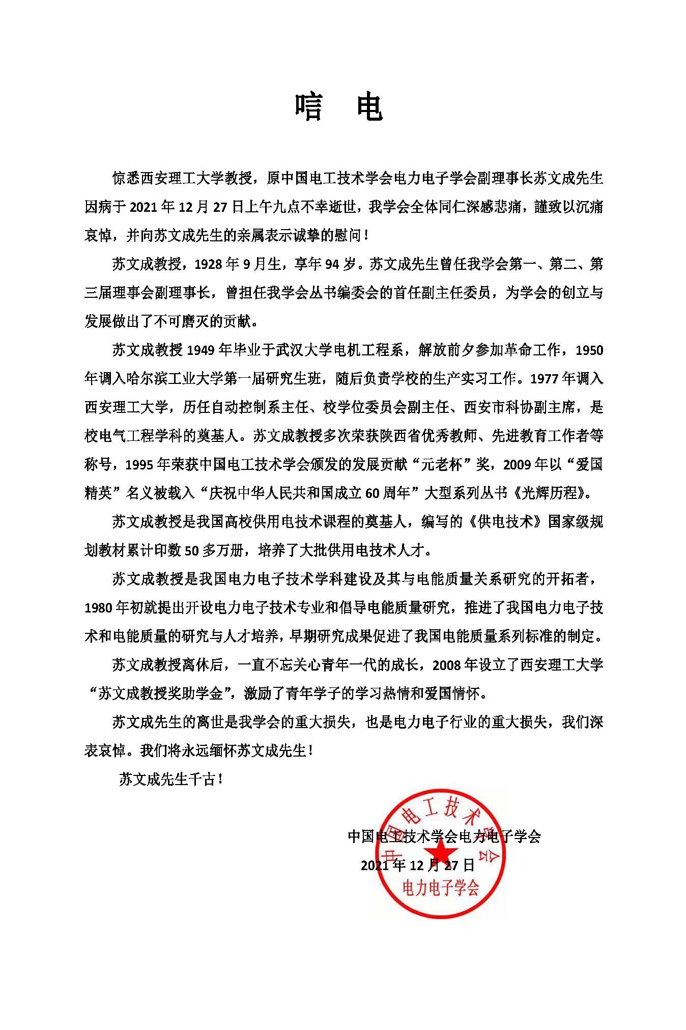 中国电工技术学会电力电子学会 唁电